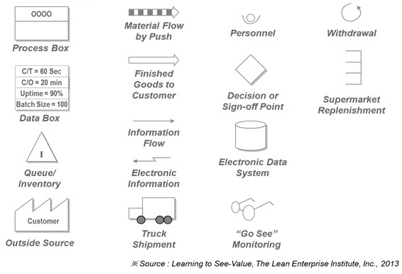 [4] 낭비요소를 부각하고 이를 제거하여 Future-State Value Stream을 구현하는 Communication 툴이며, Business Planning 및 Process 개선관리 툴로 활용 가능 (“Learning To See” The Lean Enterprise Institute, Inc., 2003)