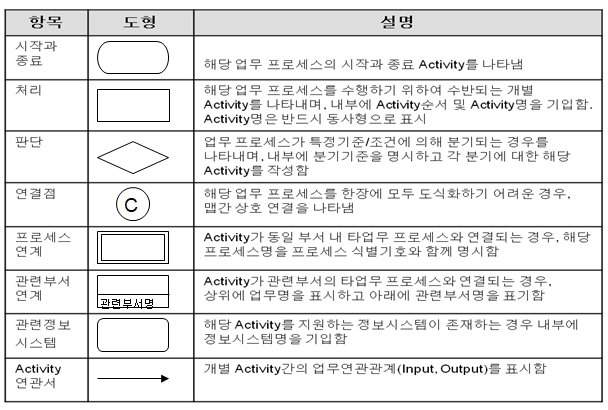 ‘프로세스 맵’이라고 하면 일반적으로 ‘상세 프로세스’을 지칭하는데, 이는 하위레벨의 프로세스 즉, 액티비티 수준까지 프로세스를 그린다. CASE툴 사용이 일반화되어 있는 요즘은 보다 용이하게 업무 프로세스를 그리기도 한다. 한 기업의 업무 프로세스는 업무에 가장 가까이 있는 사람[1]이 가장 잘 알기 때문에 이들과 함께 혹은 이들이 프로세스 맵을 그리게 된다. 상세 프로세스 맵을 작성하는데 필요한 구성요소들의 유형을 설명하면 다음 (표 1)과 같다.