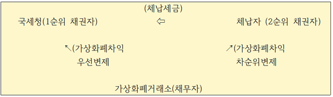 국세청이 체납자에게 청구할 수 있지만, 체납자가 가상화폐로 번 돈을 숨길 수 있기에 거래소에 직접 청구할 수 있다. 이 경우 국세청은 거래소에 대해 1순위 채권자, 체납자는 거래소에 대해 2순위 채권자가 된다.