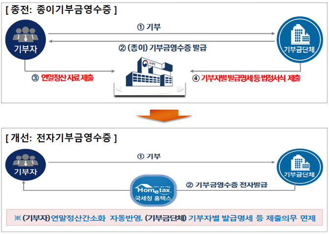 기부금 단체는 영수증 발급‧관리 비용이 줄어들며, 올해 7월 1일 이후 발급한 전자 영수증은 법정서식 작성·보관·제출 의무에서 제외된다.