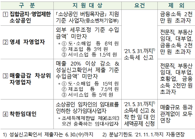 지원 대상은 집합금지・영업제한 소상공인 외에도 영세 자영업자, 매출급감 차상위 자영업자, 착한 임대인 등이다.