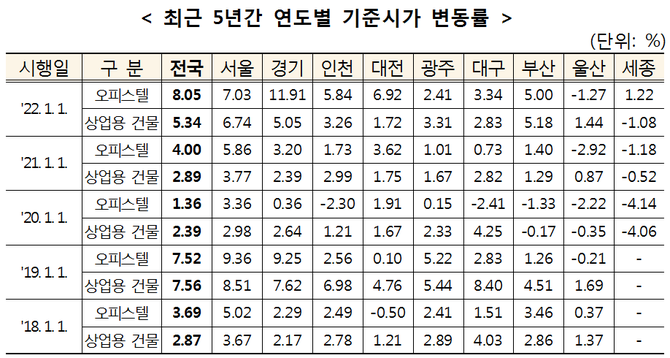 오피스텔 고시 가격은 전년 대비 평균 8.05%, 상업용 건물은 평균 5.34% 오르면서 2020년 이후 최고 상승세를 기록했다.