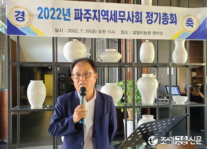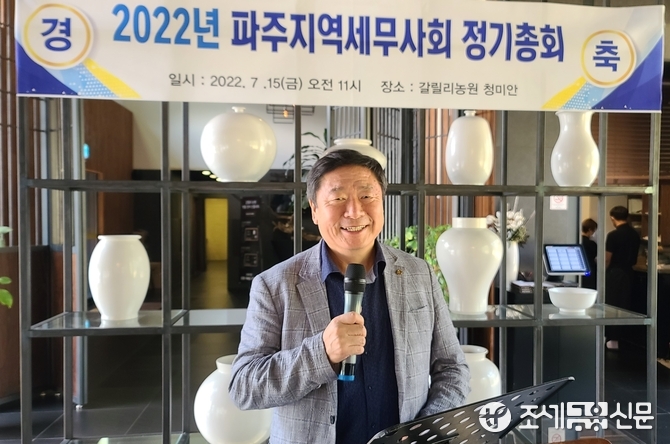 이어 "오늘 약 50명 정도 모였는데 역대 정기총회 참석인원 가운데 가장 많은 회원이 참석했다. 회원 수도 많이 늘었고, 파주지역세무사회에 대한 관심과 참여도 매우 높아졌다. 파주는 현재 70여명의 회원이 있다. 파주라는 도시도 발전하면서 새로운 신입회원도 많이 개원하고 전입했다. 파주지역세무사회도 많은 발전을 했다. 역대 2010년, 2015년 2017년 최근 2021년까지 우수지역세무사회로 지정됐다. 현재 파주지역세무사회를 이 반열에 이르도록 고생하신 역대 회장님들이 계신다. 이길신, 주영, 이순배, 김준식 전 회장의 노고와 업적에 누가 되지 않도록 남은 임기 동안 열심히 하겠다"라고 전했다.