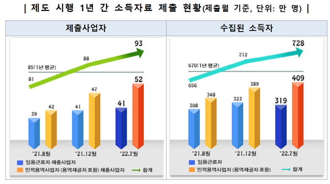 특히 올해 7월 기준으로는 사업자 93만명이 일용직 319만명‧특수고용직 409만명 등 총 728만명의 소득자료를 제출했다.