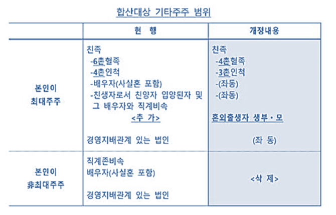 기타 친족 기준의 경우 배우자·직계존비속·특수관계법인 등은 그대로 유지하되 6촌 혈족은 4촌 혈족으로, 4촌 인척은 3촌 인척으로 각각 변경해 공정거래법상 친족 범위와 기준을 맞춘다.
