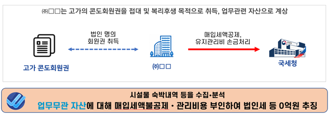 국세청은 실제 시설물 숙박내역 등을 자료 수집하여 이용자와 법인의 업무관련성이 없다는 점을 증명하여 부가가치세 매입세액 불공제, 유지‧관리비용 손금불산입하여 법인세 등 수억원을 추징했다.