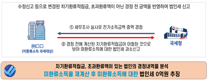 국세청은 신고 검증 과정에서 경정 내역을 반영하여 과세대상 미환류소득을 재계산 후 미환류소득에 대한 법인세 수억원을 추징했다.