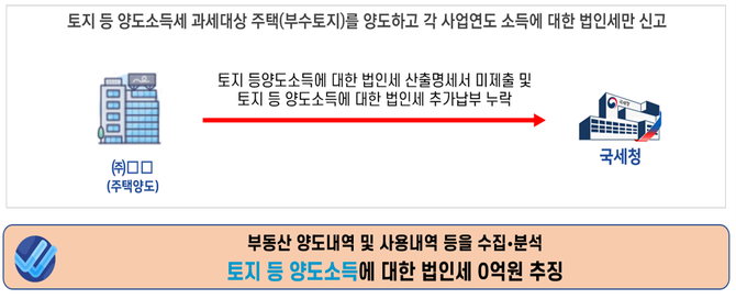 국세청은 법인별 부동산 양도내역 등을 분석하여 추가납부 누락사실을 확인하고 토지 등 양도소득에 대한 수억원을 추징했다.