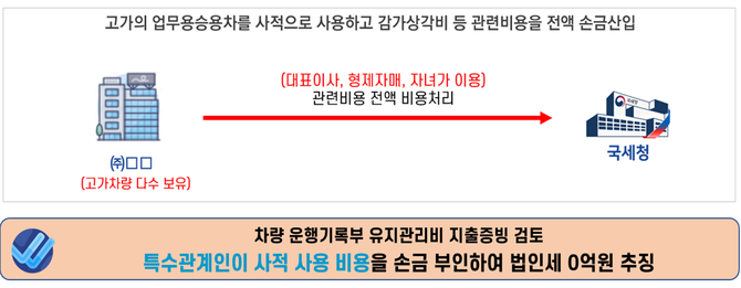 국세청은 법인 보유 업무용승용차의 운행기록부와 유지관리비 등 지출증빙을 대조하여 검토한 바, ㈜□□는 운행일지를 허위로 작성하였으며, 업무목적 사용내역이 확인되지 않았다.