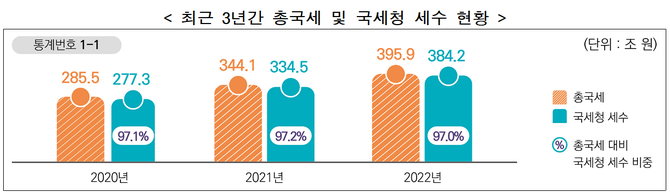 국세청 소관 세금수입은 2020년 285.5조원에서 2021년 344.1조원, 2022년 395.9조원으로 가파르게 성장했다.