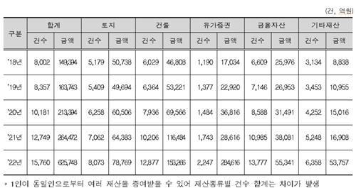 재산 종류별로 보면 유가증권이 28조5천억원으로 2018년(1조7천억원)의 16.7배 수준이었다. 주식 상속이 크게 늘어난 것이다. 건물이 15조3천억원, 예·적금 등 금융자산이 5조5천억원으로 4년 전보다 각각 227.4%, 113.0% 증가했다.