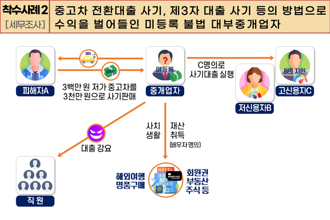 (조세금융신문=고승주 기자) 국세청이 오는 6월까지 2차 불법사금융 공조조사 179건에 착수한다고 20일 밝히며, 주요 조사 사례를 공개했다.
