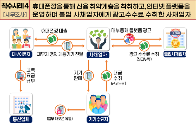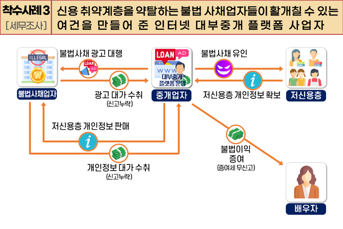 국세청은 금융감독원이 적발(지자체, 경찰청, 금융보안원 합동점검)한 온라인 대부중개 플랫폼 자료를 협조받아 조사에 착수했으며, 대부중개 및 광고대행 수수료를 신고누락, 대부업자에게 불법으로 판매한 개인‧신용정보 대가 신고누락, 중개수수료 등 불법소득을 배우자에 무상증여하여 고가의 부동산 취득 등 혐의에 대해 조사를 전개 중이다.