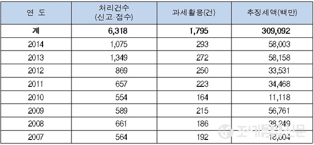 국세청은 이중 1,795건(28.4%)을 과세로 활용해 3,090억원을 추징 고지하였다.