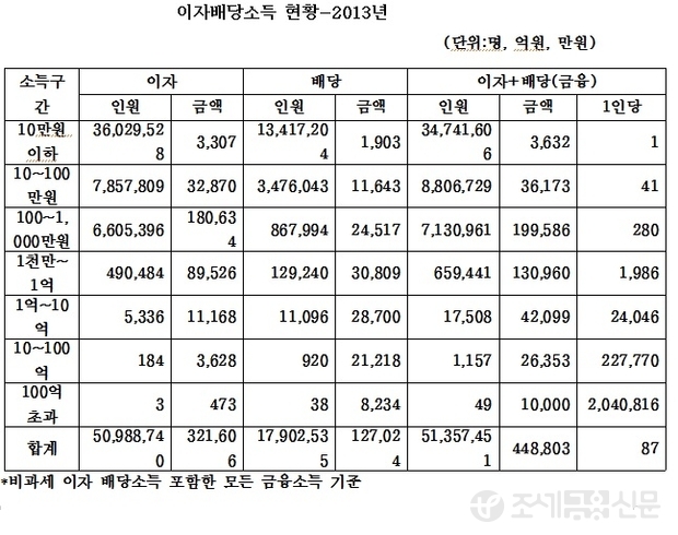 (조세금융신문=김사선 기자) 2013년 현재 우리나라에서 이자와 배당소득으로 1억 넘는 소득을 올린 억대 금융소득자는 18,714명, 소득금액은 7조 8,452억이며, 이중 소득이 100억 넘는 금융소득자도 49명, 소득금액은 1조원인 것으로 나타났다.