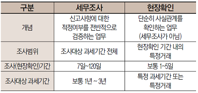 다만, 과세관청이 현장확인 기간을 장기간 운영하거나, 당초 현장확인 출장증에 명시된 내용을 확인하기 위해 확인범위를 지나치게 확대할 경우, 납세자 입장에서는 세무조사로 오해할 수도 있다. 하지만 세무조사와 현장확인은 명백히 구분되는 업무이다.