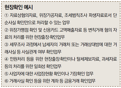 현장확인이란 각 세법에 규정하는 질문조사권 또는 질문검사권에 따라 세원관리, 과세자료 처리 또는 세무조사 증거자료 수집 등 다음의 어느 하나에서 예시하는 업무 등을 처리하기 위하여 납세자 또는 그 납세자와 거래가 있다고 인정되는 자 등을 상대로 세무조사에 의하지 아니하고 현장확인 계획에 따라 현장출장하여 사실관계를 확인하는 행위를 말한다”고 규정하고 있다.