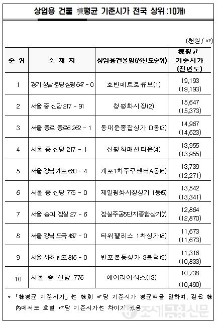 또, 상업용 건물의 경우 경기도 분당시 소재 호반메트로큐브의 기준시가가 가장 비싼 것으로 조사됐다.