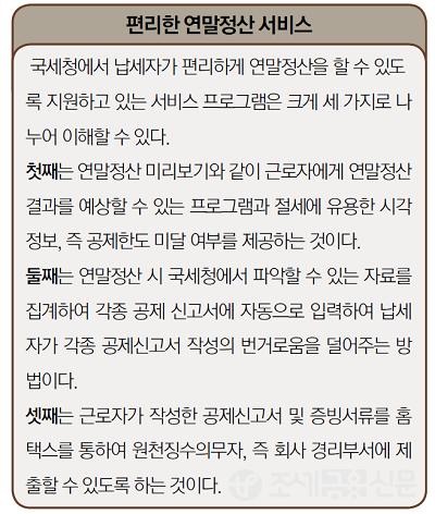 편리한 연말정산서비스는 국민의 눈높이에서 납세자에게 정말 필요하고 체감할 수 있는 국세행정 서비스를 개발하였다고 볼 수 있다.