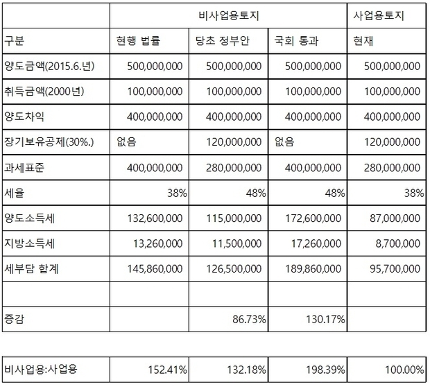A 세무사는 이에 대해 “비사업용토지는 장기보유시 물가상승율 등이 반영되어 명목상 가격만 상승했지 실질가치는 상승한 것이 없기 때문에 실질 소득이 없다”며 “이번 세법개정은 당초 사업용토지 대비 132.18% 정도로 세부담 형평을 잡으려 하다가 갑자기 198.39%로 늘어난 수정안이 국회를 통과한 것”이라고 지적했다.