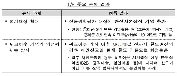 금감원은 지난 9월 11부터 10월 16일까지 은행권과 공동으로 T/F를 운영하여 신용위험평가 및 워크아웃 제도의 미비점을 발굴․보완하는 등 기업구조조정 관련 제도개선을 추진키로 했다.
