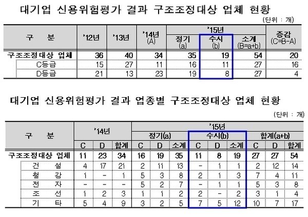 2015년 전체로는 건설이 14개사로 가장 많았으며, 철강 11개사, 전자 8개사, 조선 4개사가 각각 포함됐다.