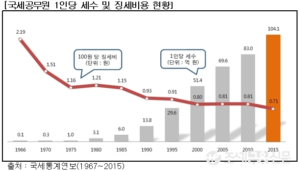 이처럼 국세수입이 대폭 증가했음에도 징세비용은 1966년 2.19원에서 2015년 0.71원으로 3분의 1 수준으로 감소됐다.