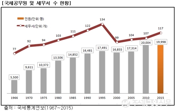 또한 국세청에 종사하는 공무원 수도 개청 당시 5,500명이었으나 2015년에는 1만9,998명으로 3.6배 증가했다.