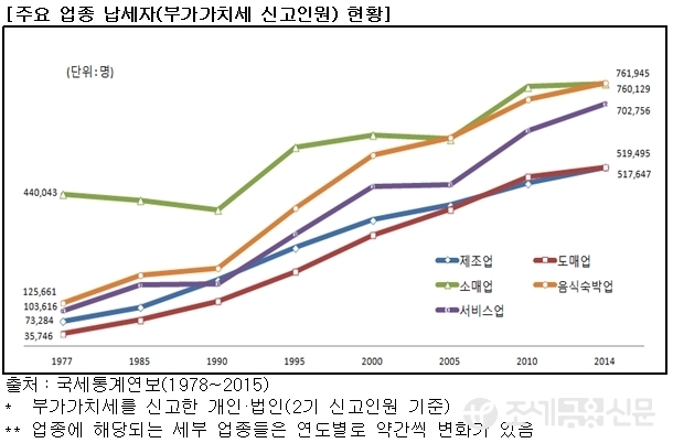 업종별 납세자 수도 크게 증가했는데, 제조업, 도‧소매업, 서비스업, 음식·숙박업 등 주요 업종 중에는 도매업이 1977년 3만5,746명에서 2014년 51만7,647명으로 14.5배가 증가해 가장 많이 증가한 것으로 나타났다.