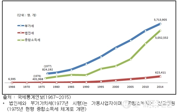 주요 세목의 납세자 수를 보면, 법인사업자수가 1966년 6600개에서 2014년 62만3400개로 94.5배 증가했다.