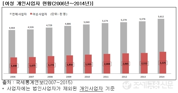 또, 전체 개인사업자 중 여성 개인사업자의 비중도 2006년 36.7%에서 2014년 39.6%로 2.9%p가 증가했다.