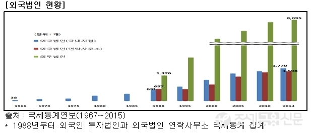 또, 본사는 외국에 있고 국내에는 수익 영업활동이 아닌 단순 보조적인 활동만을 수행하는 외국법인 연락사무소도 1988년 657개에서 2014년 1,598개로 2.4배 증가했다.