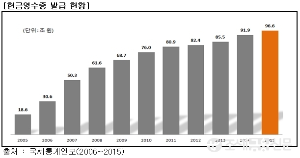 시행 원년인 2005년에는 4억5천만건에 18조6천억원이 발급됐으나 10년이 지난 2015년에는 96조6천억원(50억4천만 건)이 발급돼 5.2배(건수는 11.2배)의 높은 증가율을 보였다.