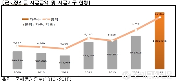 국세청이 저소득근로자에 대한 근로의욕 장려를 위해 아시아 최초로 2009년에 실시한 근로장려금 제도는 7년 동안 총 4조 2646억원을 지급했다.