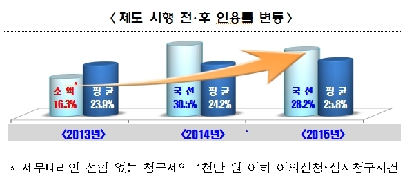 즉, 제도 시행 전인 ’13년에는 세무대리인 없이 1천만 원 이하의 이의신청, 심사청구를 진행한 납세자의 인용률은 16.3%로 전국 평균 인용률 23.9%에 미달하는 수준이었으나 제도 시행 이후 국선대리인의 도움을 받은 납세자의 인용률은 2014년 30.5%, 2015년 28.2%로 제도 시행 전보다 2배 가까운 인용률을 기록했다.