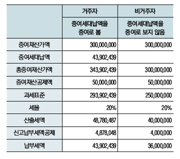 비거주자인 경우에는 증여세대납액을 증여로 보지 않기 때문에 3억 원만을 증여재산가액으로 보아 세액을 산출하면 약 3,600만 원이 산출된다.