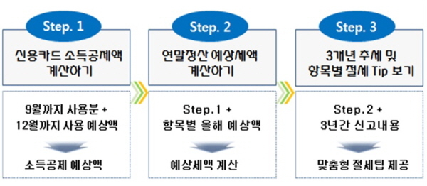 ‘연말정산 미리보기’ 서비스는 근로자에게 9월까지의 신용카드 등 사용액과 자신에게 맞는 절세 팁과 공제 한도 등을 알려줘 사전에 절세계획을 짤 수 있도록 단계별로 도와주는 서비스다.