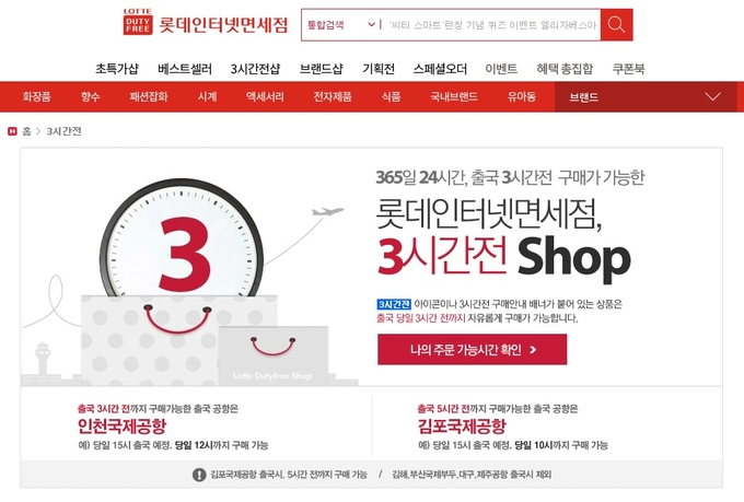 롯데면세점 홈페이지에 따르면, 롯데는 인천국제공항에서 출국하는 여행객은 인천공항물류센터를 통해 출국 전 3시간 전까지 면세점 쇼핑을 할 수 있다고 홍보하고 있다. 이른바 3시간 샵이다. 롯데면세점은 김포공항에서 5시간 전 샵 서비스를 제공한다.