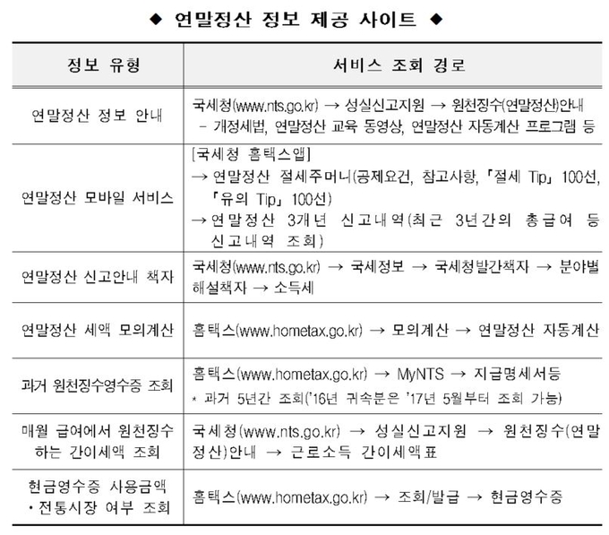 국세청은 연말정산을 위해 간소화자료 확대 제공과 다양한 콘텐츠를 지원하고 있다. 4대 보험료(국민연금·건강보험료), 폐업 병원의 의료비 자료를 연말정산간소화에서 제공하고 절세 도움말, 유의 사항, 서비스 이용절차 등 각종 정보를 이용자 눈높이에 맞춰 책자, 리플릿, 동영상 등으로 지원한다.