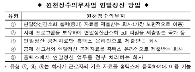 다양한 방식으로 연말정산을 할 수 있도록 홈텍스 초기화면에 연말정산 유형이 안내되기때문에 원천징수의무자가 회사의 전산 및 업무 환경에 맞는 유형을 선택해 연말정산을 손쉽게 진행할 수 있게 된다.