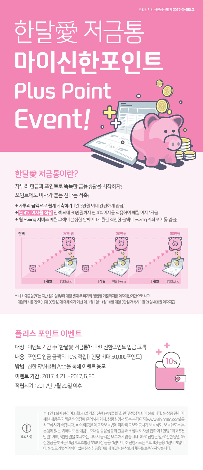 이번 이벤트는 해당 통장에 현금뿐 아니라 마이신한포인트도 입금이 가능하도록 상품 업그레이드를 하고, 입금한 포인트에 포인트를 더해준다.