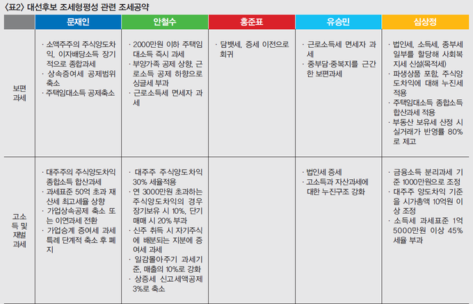 문 후보가 자산과세에서 보편적 과세를 지향했다면 안 후보는 자산과세에 대해선 고소득층에 대한 집중과세, 소득세에 대해선 보편과세에 초점을 맞추고 있다.