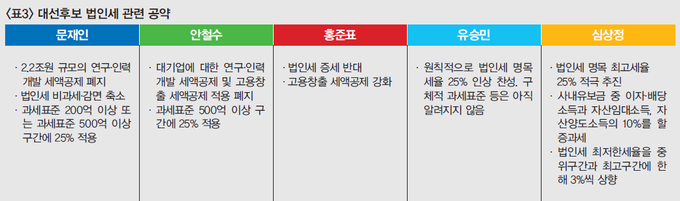 유 후보와 심 후보 역시 법인세 최고세율을 25%로 올리는 데 찬성하고 있다.