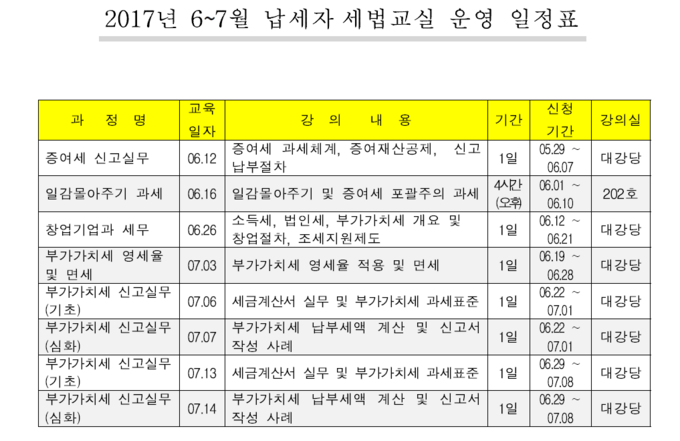 6월은 증여세 신고실무(12일), 일감몰아주기 과세(16일) , 창업기술과 세무(26일) , 7월은 부가가치세 영세율 및 면세(3일), 부가세 신고실무(기초 6일, 13일, 심화 7일, 14일) 교육이 진행될 예정이다.
