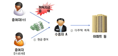 대구에 사는 보건소 공중보건의 B씨는 재력가인 모친과 외조모 등으로부터 현금으로 거액의 돈을 증여받았지만, 증여세는 한 푼도 내지 않았다. B씨는 이 돈으로 서초구에 위치한 재건축 아파트 등 10억원대 부동산을 하고, 본인 거주 고급 아파트 전세금으로 사용했다. 국세청은 B씨에 대해 억대 증여세를 부과했다.