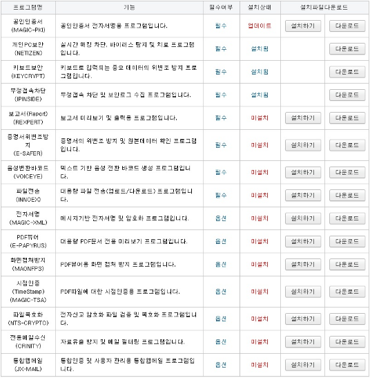 연말정산 간소화 서비스 역시 최저 2개 이상(통합설치 프로그램, 출력 관련 보안 프로그램)의 EXE 프로그램을 설치해야 하며, 출력 등을 다른 서비스를 이용하려면 추가 설치가 필요하다.