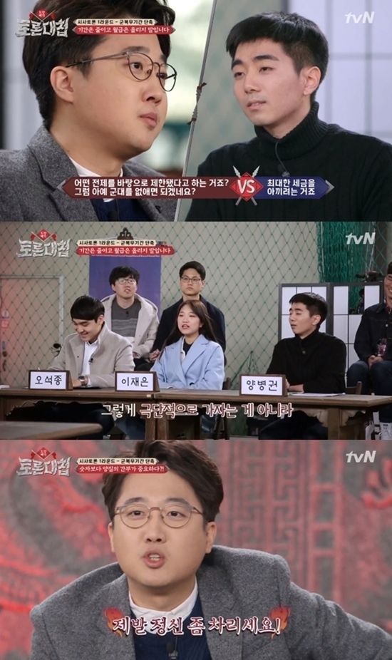 13일 방송된 tvN '토론대쳡-도장깨기'에서 이준석은 대학생들이 주장하는 군복무 기간 단축에 대해 반대표를 던졌다.