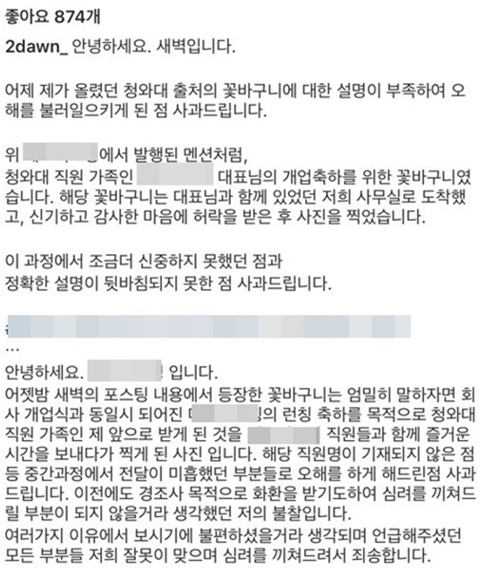 새벽은 지난 25일 자신의 SNS에 "청와대에서 우리의 사업을 격려하는 차원에서 화환을 보내왔다. 근무자 식구에게 보내는 관습적인 예절이란다"라는 글을 올리며 논란의 불을 지폈다.