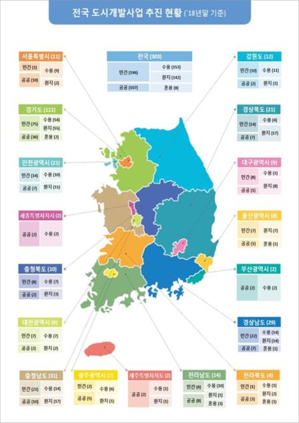 국토교통부는 17개 광역지자체 등을 대상으로 지난 2~3월까지 실시한 도시개발사업 현황조사 결과를 바탕으로 ‘2018년 말 기준 전국 도시개발사업 현황 통계를 발표했다.