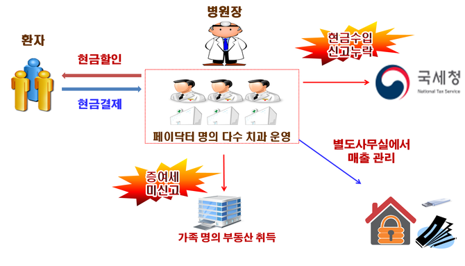 그는 이렇게 분산한 병원별 수입을 별도 사무실에서 관리하며 소득을 분산하고, 건강보험적용을 받지 않는 임플란트에 대해 현금할인을 유도해 이중장부로 관리했다. 이렇게 은폐한 자금은 가족 명의의 부동산 취득자금으로 쓰였지만, 증여세는 내지 않았다.